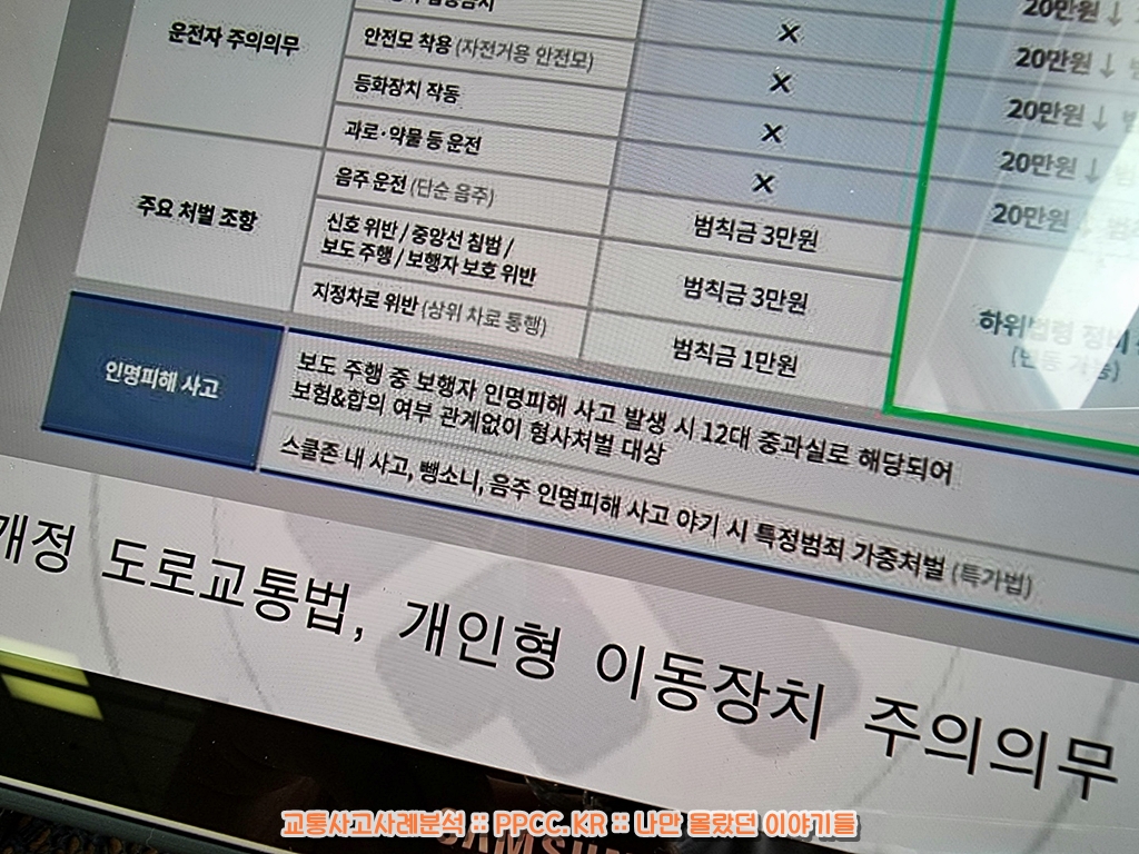 특히 일반인들이 잘 모를 수 있는 도로와 음식점 입구의 짧은 인도 침범 구간이나 건물 내 주차장으로 진입하는 입구 등도 인도로 포함되므로 해당 구역에서 나오는 사람과 부딪친다면 12대 중과실로 형사처벌받게 됩니다. 자전거 도로로 주행만 할 수 있다 뿐이지 막상 오토바이로 규정되어 많은 규제에 휩싸이게 되었습니다. 운행하는 분들이 항상 조심하고 경각심을 가지고 운행해야 할 것 같습니다.